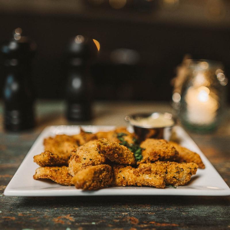 Garlic, lemon, white wine reduction. Served with salad and bread.